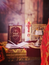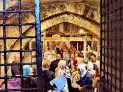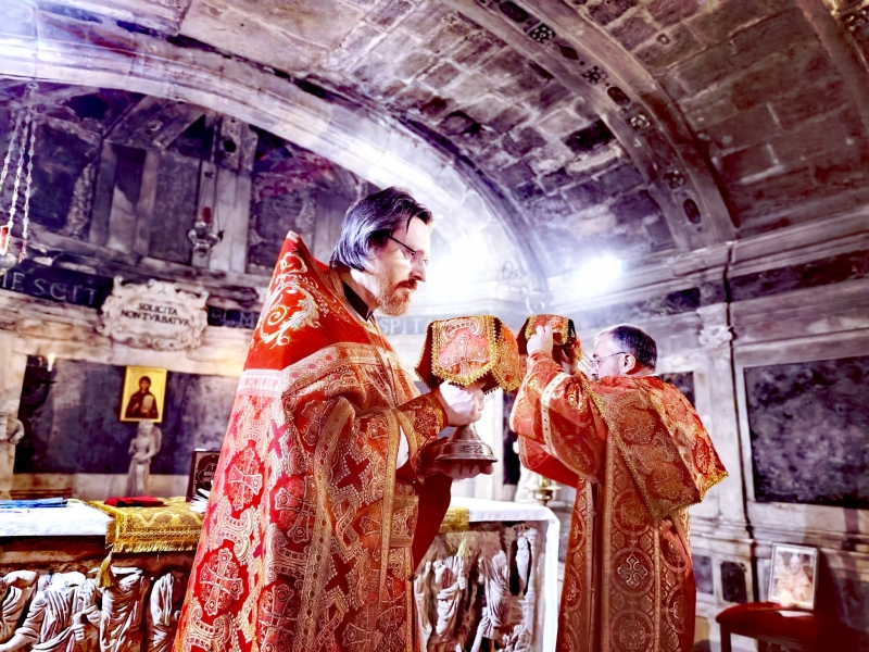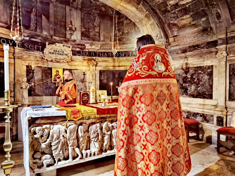 Божественная литургия была совершена в крипте католического храма в честь святой Марфы, где находится наиболее древний престол храма, которым служит сама гробница (мраморный саркофаг) жены-мироносицы.